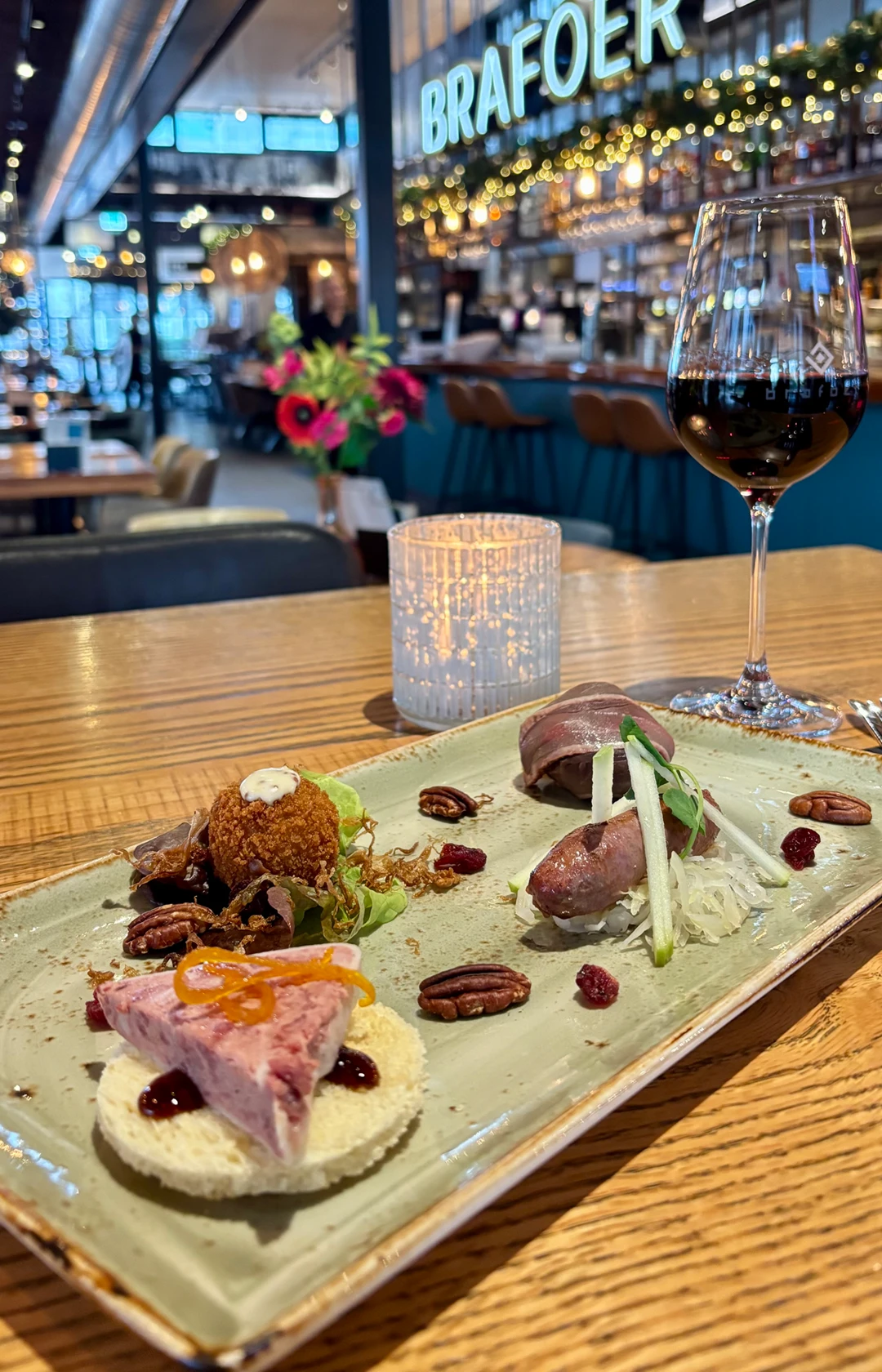 – Wilde eendenborst (gerookt), bonbon met uien marmelade.– Bitterbal van wild en bier (het IJ), mosterdressing, gefrituurde zuurkool.– Hert chipolata worstje op zuurkool en granny Smith.– Crostini met fazant paté, balsamico stroop. – Pecannoten en cranberry.